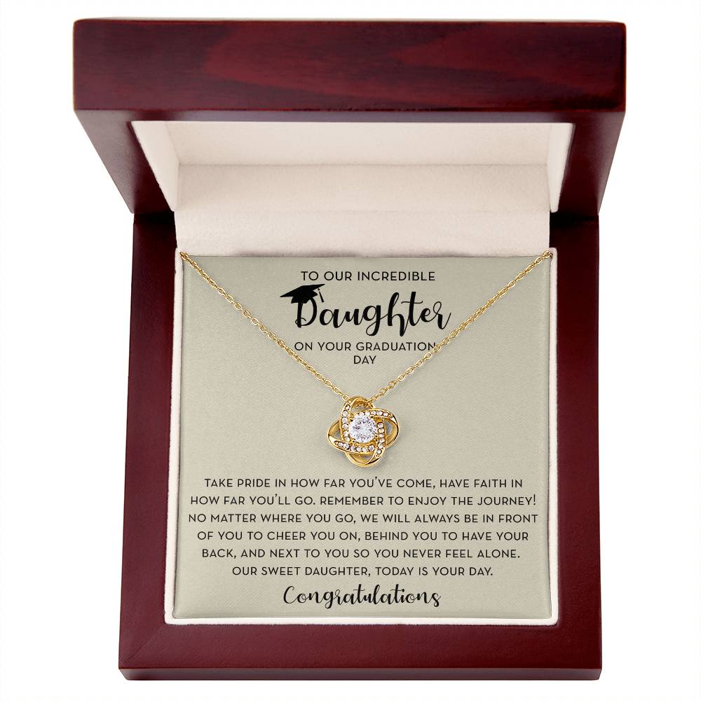 Give your Graduating Daughter a beautiful knot necklace for her Graduation. Graduation is a day full of emotion and this beautiful necklace and encouraging message is the perfect gift to show your daughter that you support her. This beautiful necklace would make a perfect Graduation Gift for your daughter as she graduates from high school, college, or grad school.