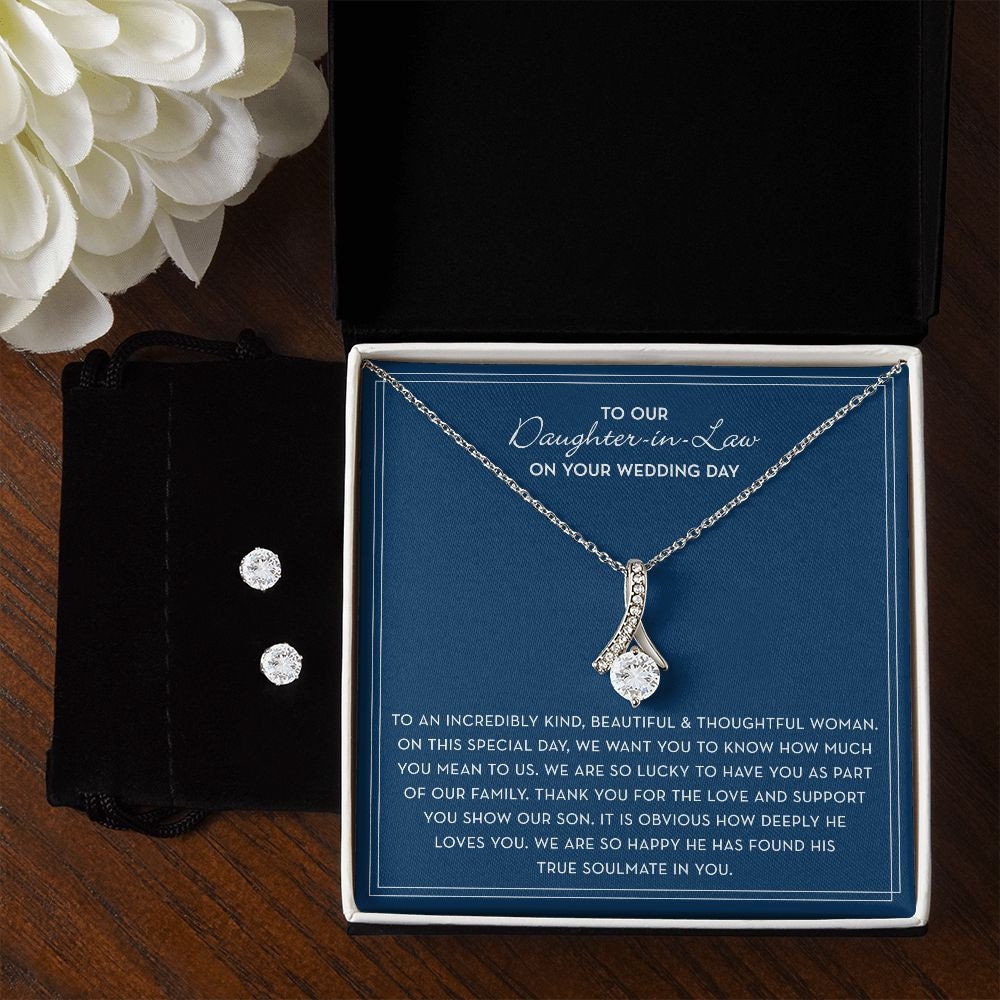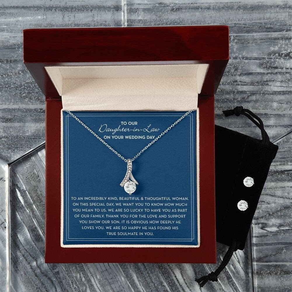 Show your daughter-in-law your love on her Wedding Day to your son. This beautiful necklace and earring set, along with the included message card is the perfect gift for your daughter-in-law on her wedding day. This beautiful jewelry set is a perfect gift for your Daughter-in-Law on her Wedding Day to your son.