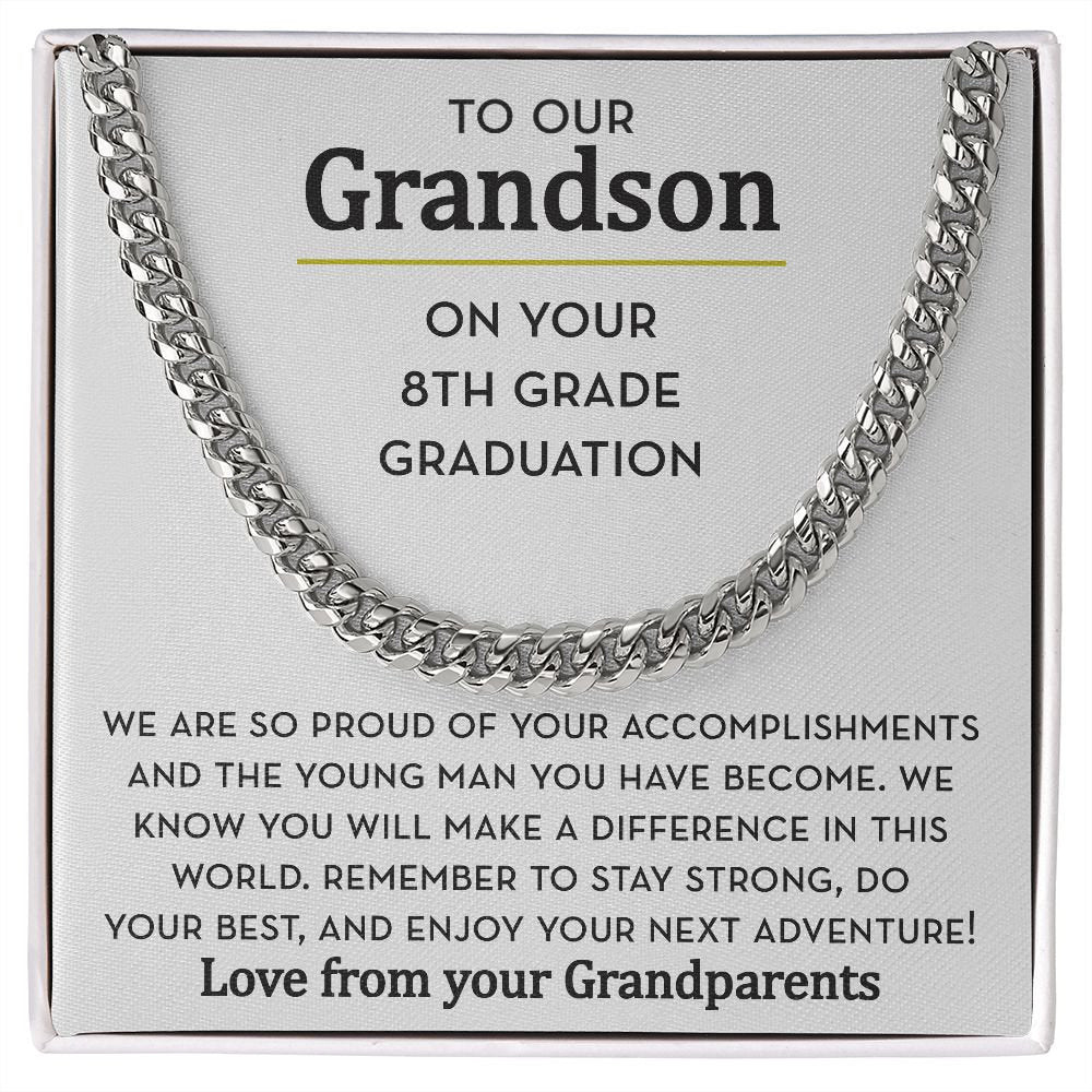 Give your Grandson a modern Chain Link Necklace for his 8th Grade Graduation. This high-quality chain will be something he cherishes for years to come. Show him how proud you are of him and mark his achievement with this Grandson 8th Grade Graduation Gift from his Grandparents.