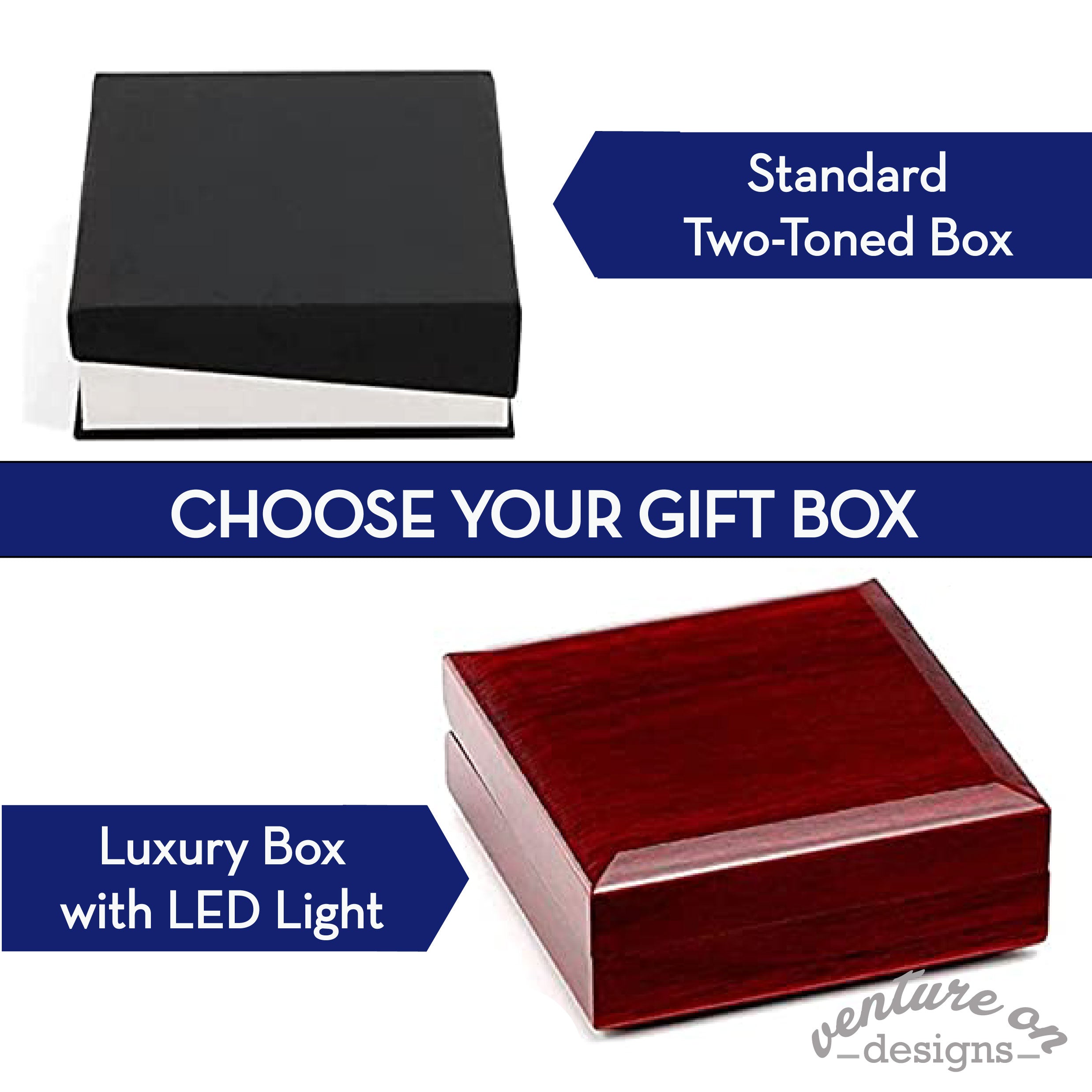 - Comes in a black and white box, or upgrade to a Luxury Mahogany Box with a built-in LED light.