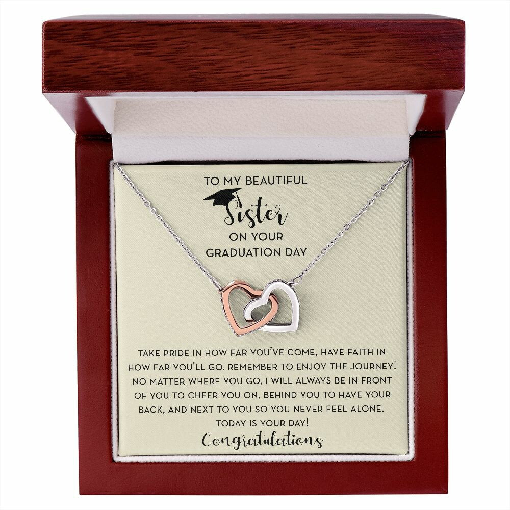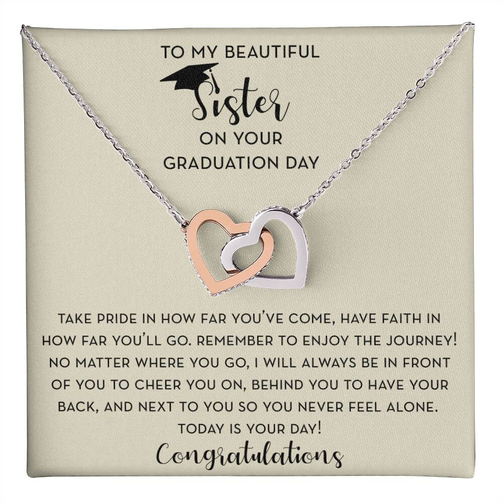 Give your Graduating Sister a beautiful linked hearts necklace for her Graduation. Graduation is a day full of emotion and this beautiful necklace and encouraging message is the perfect gift to show your daughter that you support her. This beautiful necklace would make a perfect Graduation Gift for your sister as she graduates from high school, college, or grad school.